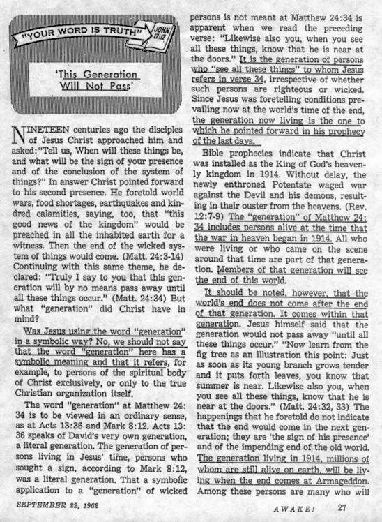 Awake!, 10-8-68, p.13 So according to the above article, the 1914 generation doesn’t include babies or children. One must have been 15 years old in 1914 to be considered part of the generation.
