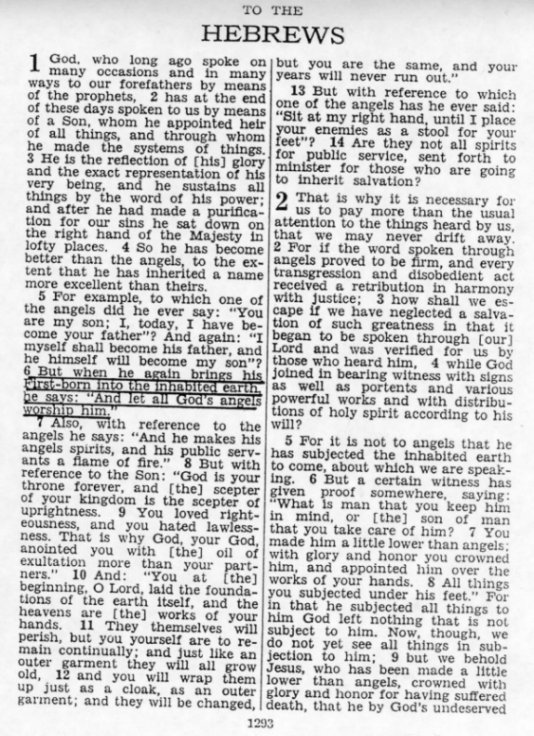 Hebrews 1:6 as, “But when he again brings his First-born into